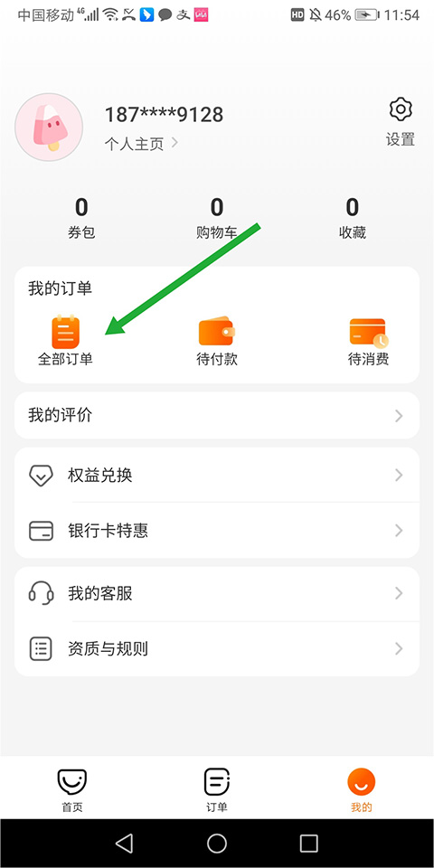 2.另一个入口是在口碑APP的【我的】页面,点【全部订单】,也是一样找到没用的那个商品,点进去【查看订单】,就能找到【申请退款】了。