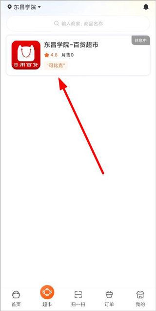1、打开软件,主界面布局挺清晰的,首页、超市、扫一扫、订单、我的,这几个功能区一目了然。首页上给你推的,基本都是合作的学校食堂窗口和一些热门餐品。大家看下面这张截图就明白了。