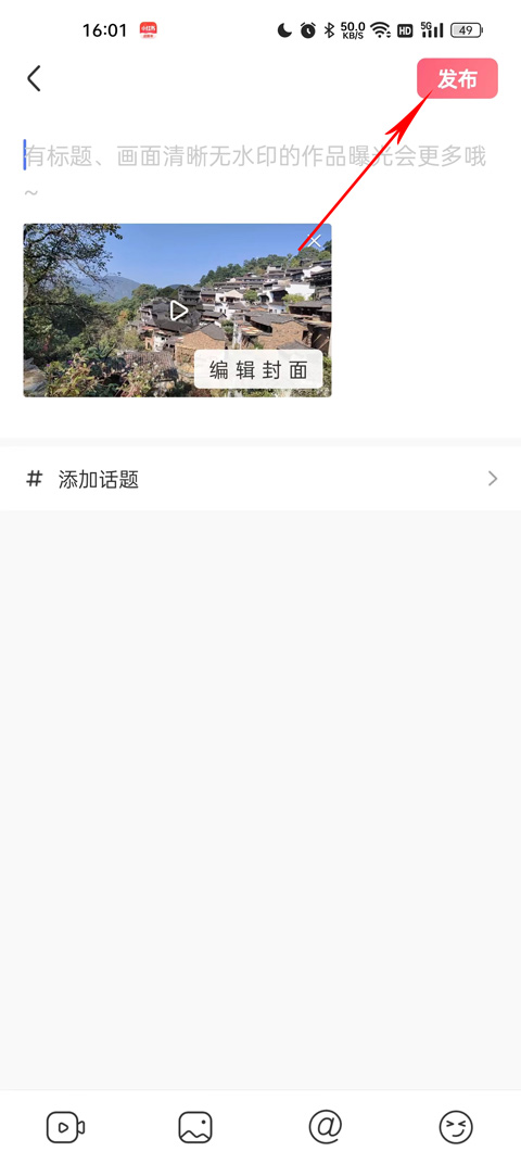 4、最后一步,给你的视频写个标题或者介绍,可以加个热门话题来增加曝光,检查没问题了,再点右上角的“发布”就大功告成了。
