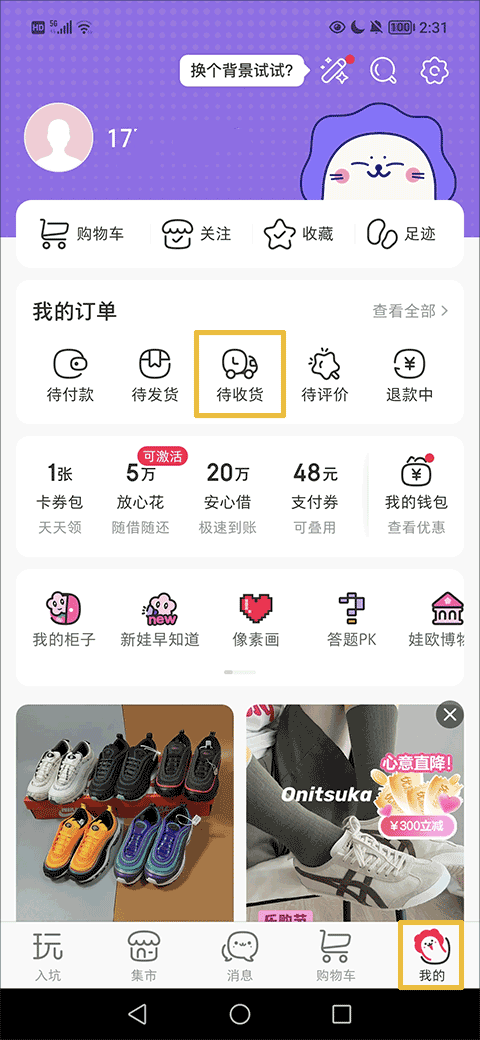 1、想看你的快递到哪了,先打开App,在“我的”那个主界面,找到“待收货”这个选项,戳它。