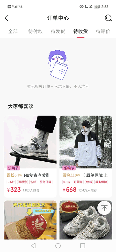 2、点进去之后,就到了订单中心,在“待收货”这个列表里,你买的所有在路上的东西都在这儿了,物流信息一目了然。