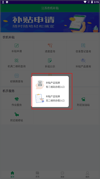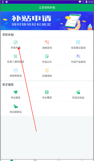 1、下载安装好江苏农机购置补贴app,进入首页点击申请补贴。