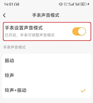 3、看到那个声音模式的开关没?把它打开就行了,这样手表的各种提示音就都有了。