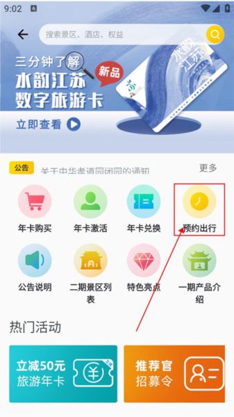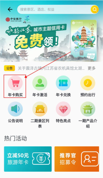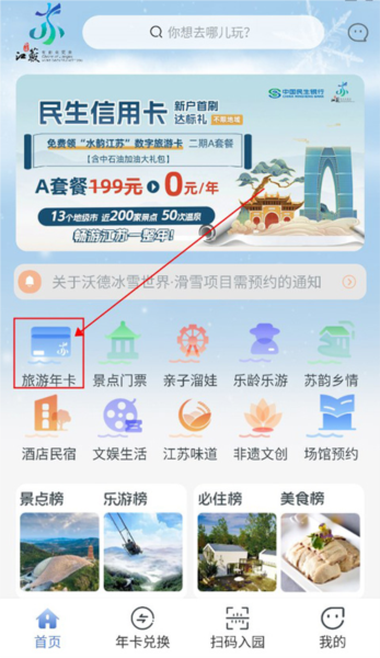 大家先在手机上把这个APP下好打开,看到首页那个“旅游年卡”的入口没?点它就对了。