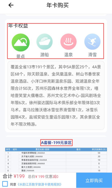 在这里你就能看到旅游卡具体都包含哪些好东西了,选一个你中意的套餐,然后点右下角的“购买”就能开通。开通后,江苏好多大景点就任你玩啦。