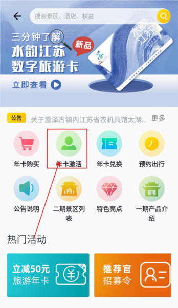 对了,买完卡不是马上就能用,得先激活一下。回到刚才那个旅游年卡的页面,找到“年卡激活”的按钮点一下。