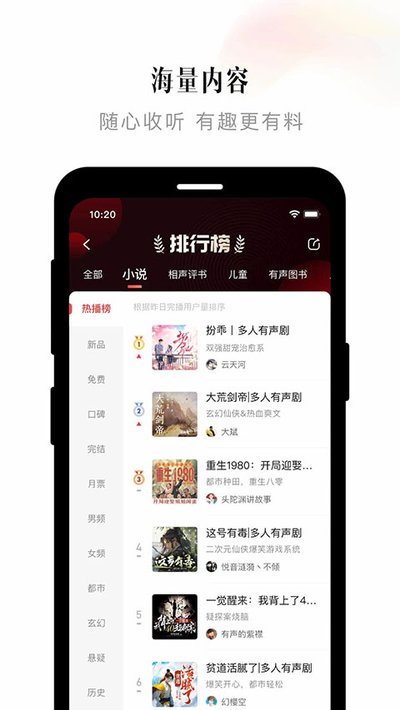 1.说到喜马拉雅,老玩家应该都知道,它早就不是一个简单的听书软件了。它的内容库真的深不见底,从专业大佬的干货分享(PGC),到各路有才网友的自制节目(PUGC和UGC),啥都有。我用了一下午,翻了翻它的分类,足足有101个,总音频数超过3.4亿条,简直离谱。不管你是想听金融财经、历史文化这种硬核知识,还是想找点小说、娱乐节目放松一下,它都能满足你。而且,它还特别照顾到了家里的小孩和老人,教育内容和经典怀旧节目都安排得明明白白。对了,它还有音频直播,连央视新闻都入驻了,想听新闻联播直接点就行,超方便。