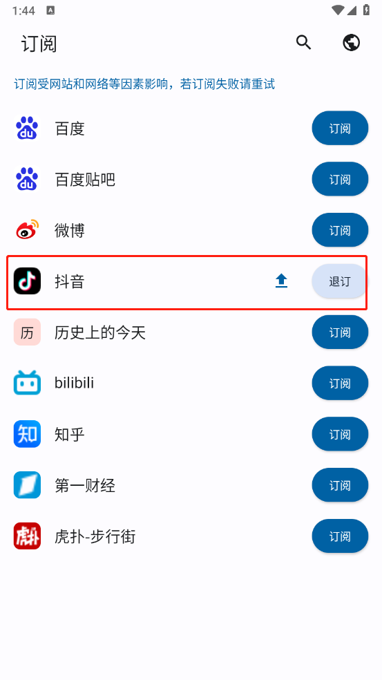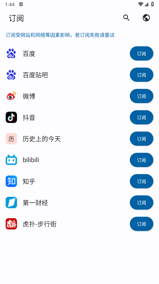 4、你想看哪个平台的热搜,就找到它,然后点一下旁边的“订阅”按钮。等个一两秒钟,这事儿就算办妥了,以后就能直接看聚合好的热搜了。