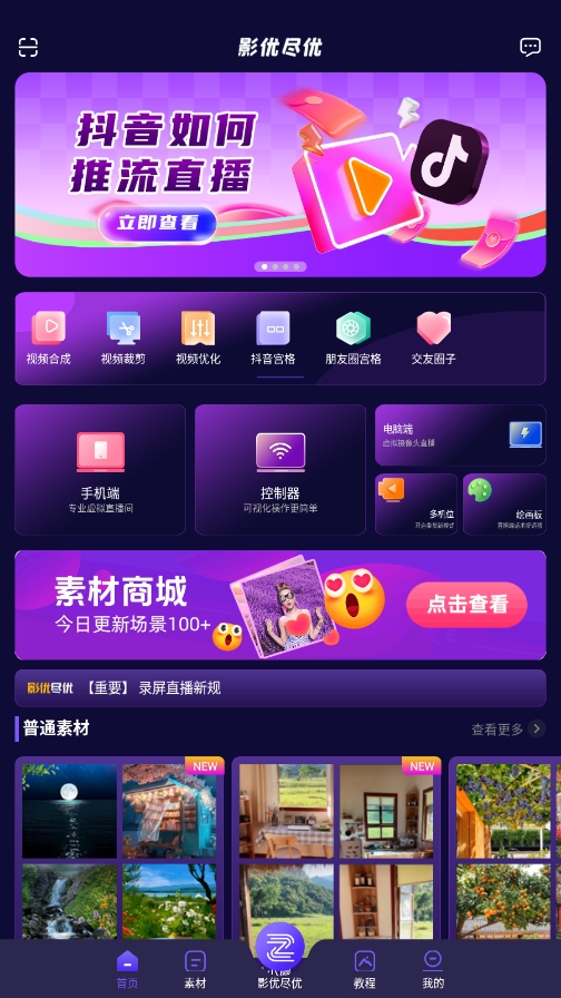 4. 在素材库这个版块,你可以从手机里导入自己的图片或视频,然后随心所欲地进行编辑和美化。