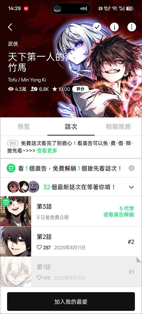2.这App用起来挺良心的,没什么烦人的广告和强制收费。大部分漫画都是免费看的,有些上了锁的章节,你要么耐心等几天,要么看个短广告就能马上解锁。如果想比别人早三天看到更新,用每天签到送的代币也完全够用。