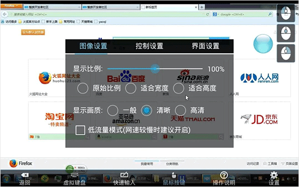 连接成功后,就进入控制界面了。讲真,这个UI稍微有点复古,但功能确实没毛病。看到右上角那个蓝色的悬浮球没,点它就能弹出或者收起菜单栏。