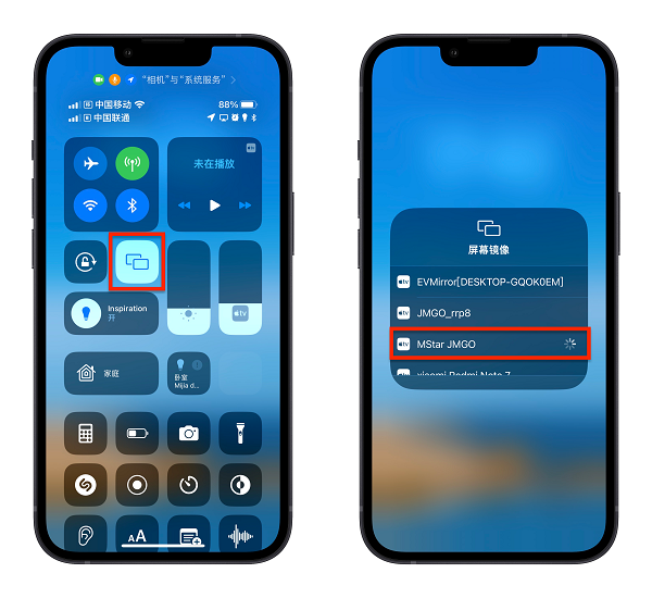 从手机屏幕右上角往下滑,拉出控制中心,找到【屏幕镜像】。点进去之后,你要选EV投屏电视端上显示的那个【本机名称】,参考上面那张图,这里就是「MStar JMGO」。