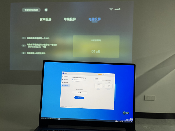 电脑投屏也简单。先把电视上的EV投屏切换到电脑投屏的页面,把那个【本机投屏码】记下来。讲真,这UI稍微有点复古,但功能确实没毛病。