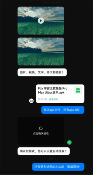一旦配对成功,两边设备上就会跳出一个跟聊天软件差不多的界面。想发文件的时候,就点那个“+”号,去相册或者文件夹里选你要传的东西,选中一点发送,文件就开始跑了。