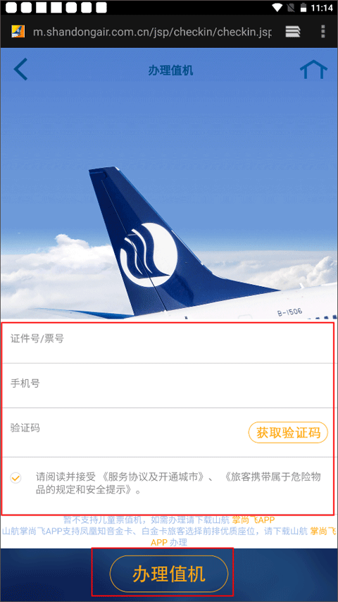 3、接着就是填信息了,把你的证件号或者票号、手机号填进去,收个验证码,最后点“办理值机”就搞定了。