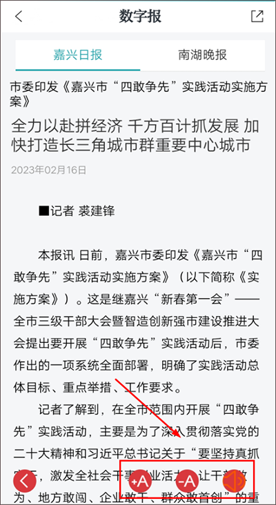 (3)对于报纸内的报道内容,用户可点击该报道的位置,即可跳转至详细文章内,在该文章内,用户可自行设置字体大小,还可选择语音读报