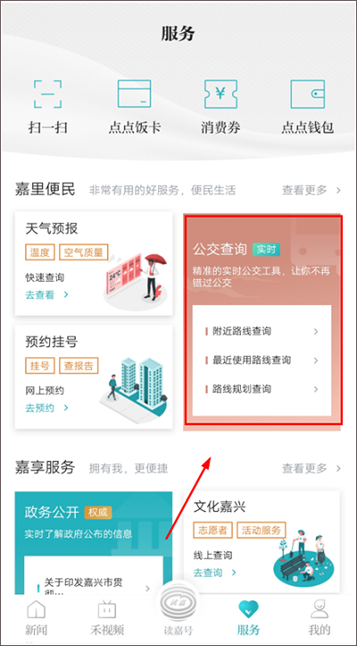 (2)在【服务】页面内,点击【查询公交】服务