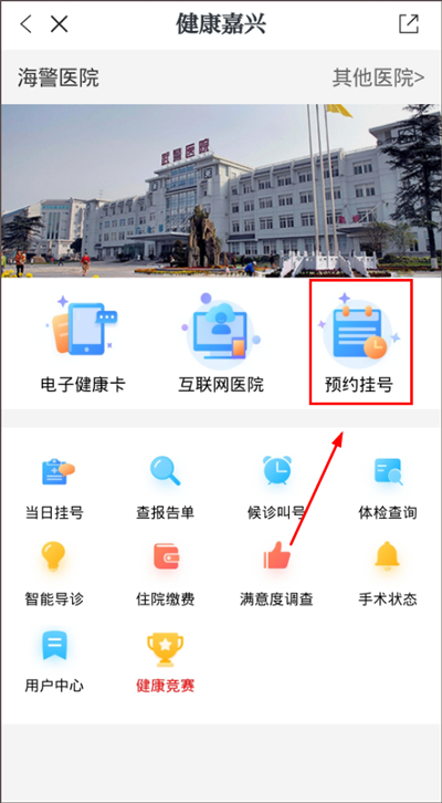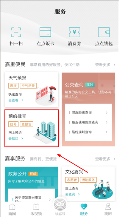 (1)同上在【服务】页面内,点击【预约挂号】服务