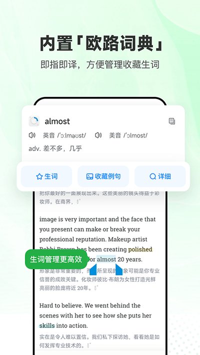 - 跟读打分这个功能我玩了一下午。你读完一句,它会给你每个单词的发音打分,帮你纠正口音问题,比自己瞎练效率高多了。