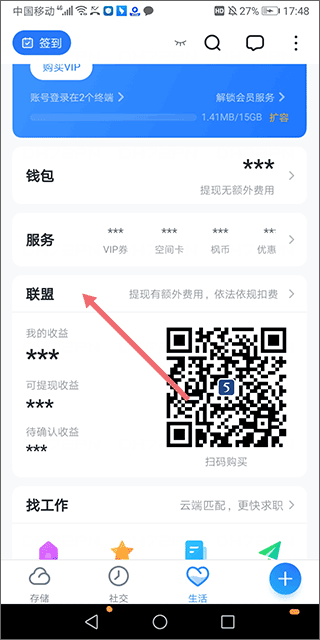 1、打开app,在“生活”主界面找到那个【联盟】入口,直接点进去。
