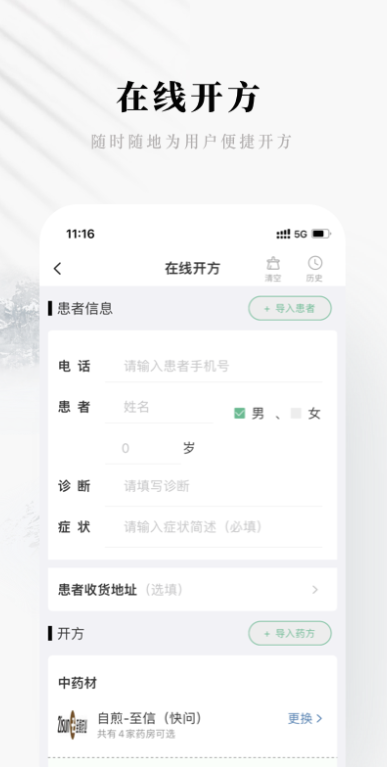 二、移动处方系统,模拟方剂模板,让名中医身在世界任何一个角落,均可为有需要咨询的人提供中医问诊服务,健康方案,并由至信药业统一发药,通过快递送药上门。