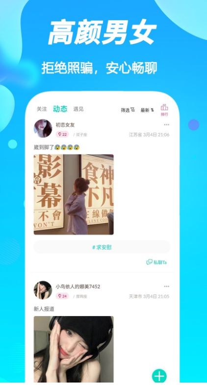 2:可以在发现页面发布自己的动态,可以发布图片以及文字,在这里可以遇到志同道合的朋友。