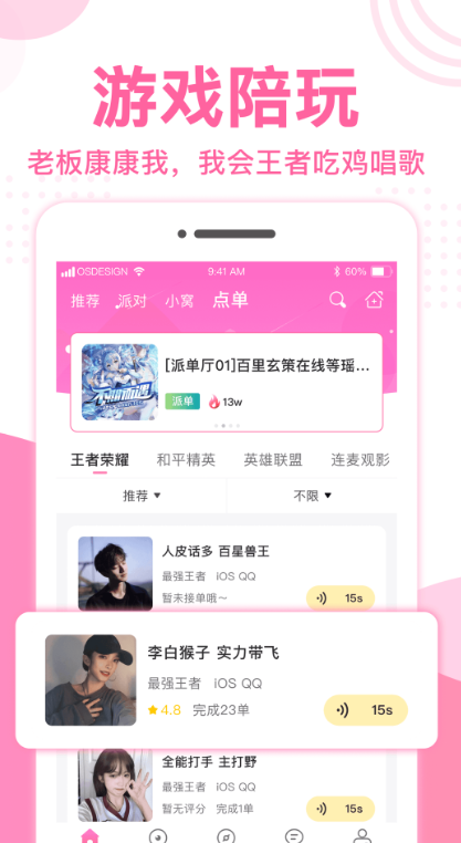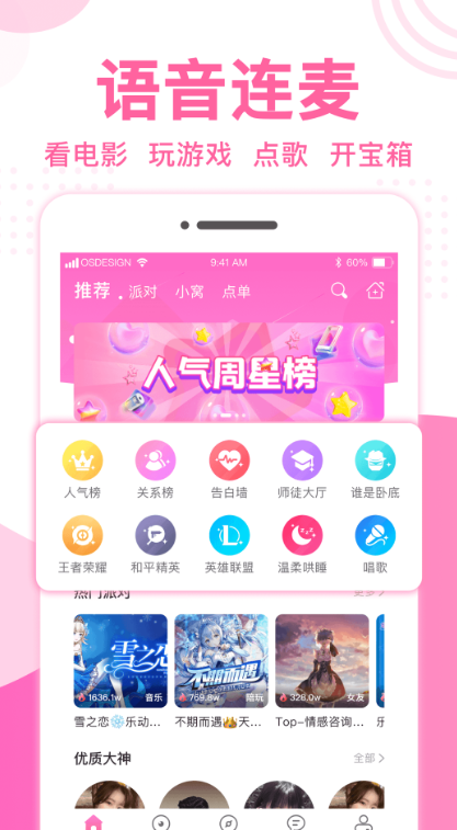 优优语音软件是一款语音聊天为主的开黑交友软件,用户可以随意下单游戏陪玩,美女大神带你飞,还可在线相亲、点唱、电竞、娱乐、谁是卧底,超多男神女神陪你嗨聊,互动玩游戏交友脱单。