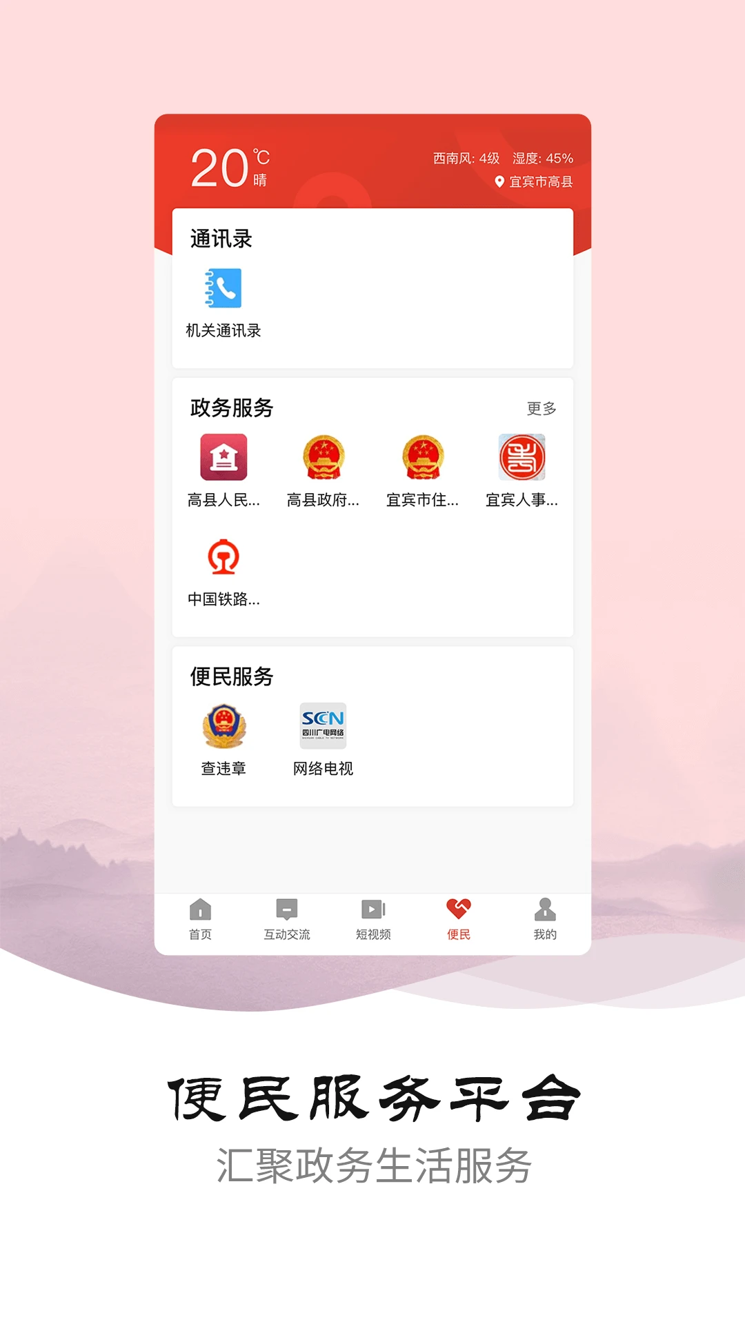 2、以服务高县人民群众为初衷创建,该APP除了服务类目外,还附带了新闻阅读,精选电视节目浏览等功能。