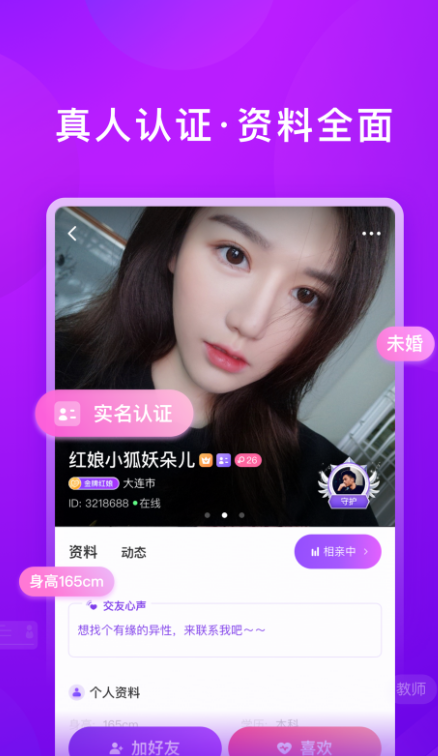 4、视频相亲,真诚在先!全面实名认证体系,杜绝照骗。