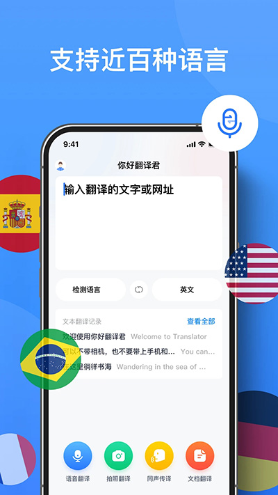 你好翻译君免付费版,是现在来说非常给力的手机翻译APP,在这款中解除了限制,直接登录后,就可以快速的输入文本,得到想要的内容。软件功能十分强大,支持近百种语言的实时翻译功能,还支持文本和图片的翻译,让你不管处在何种环境都能轻松拿捏。