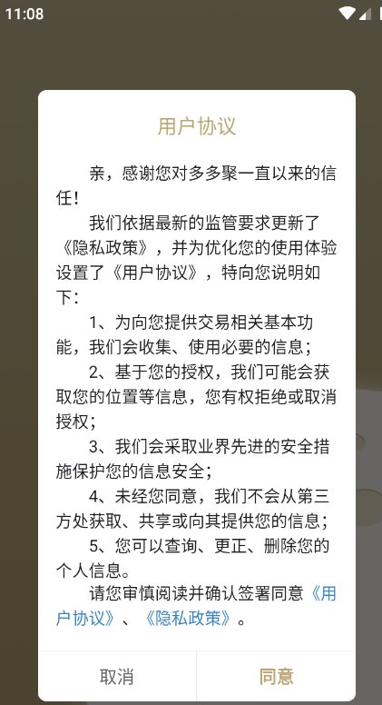 1、进入应用中心,在线获取隐私政策和用户协议,认真阅读后点击同意。
