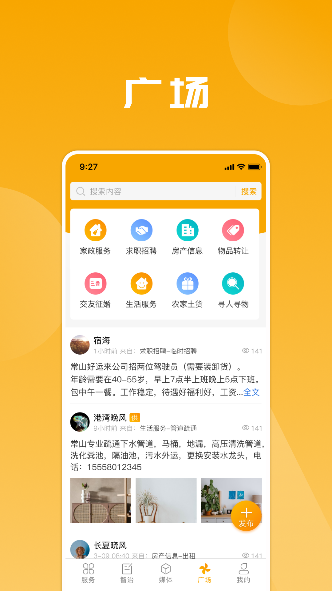 3、“广场”板块包括家政服务、求职招聘、房产信息、生活服务等内容,有这些需求的小伙伴都可以来“爱常山 U点通”APP寻找相关信息!