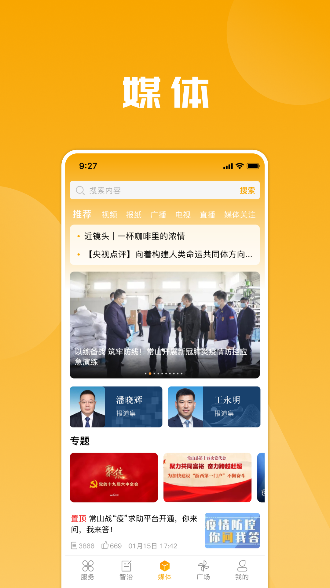 2、“媒体”板块包括头条、视频、报纸、广播、电视、直播、媒体关注等内容,第一时间全方位浏览常山权威资讯,让你成为“常山通”;