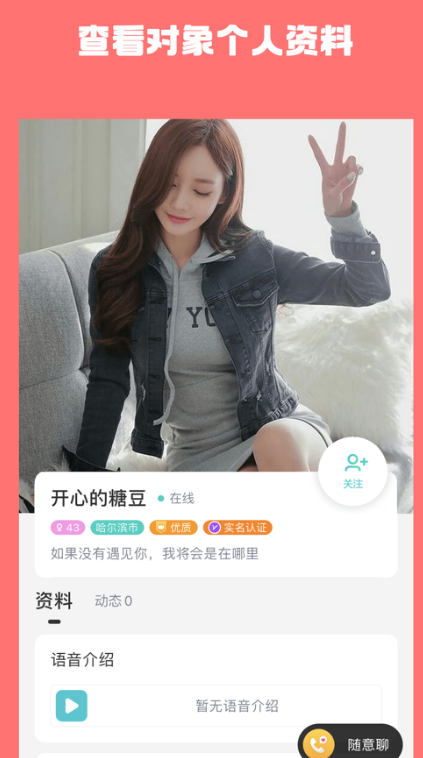3.为您带来全新的社交体验。有兴趣与城市交朋友,告别尴尬聊天,容易找到适合自己的对象。找到你的命运,让约会更容易。