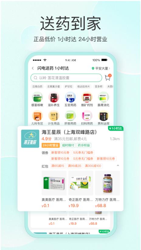 1、在线药品购买-提供普通药品和专用药品。专业药剂师为用户提供实时药物咨询,并在线开放电子处方,省钱省心;