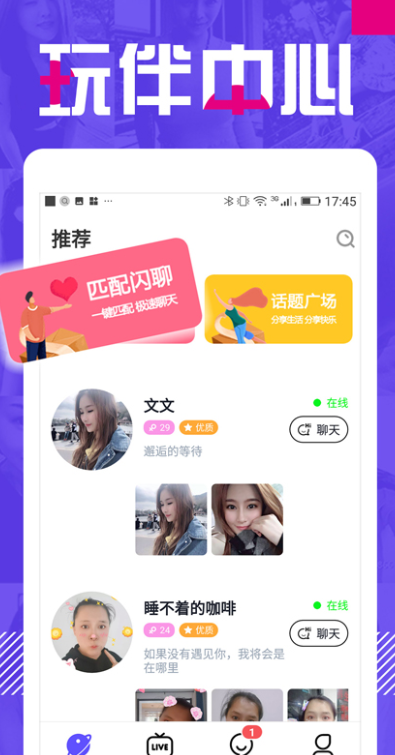 1、这里有动态、互加好友、专属房间、群聊等多种快速找到有趣人儿的方法,打破距离阻隔,找到适合你的缘分。