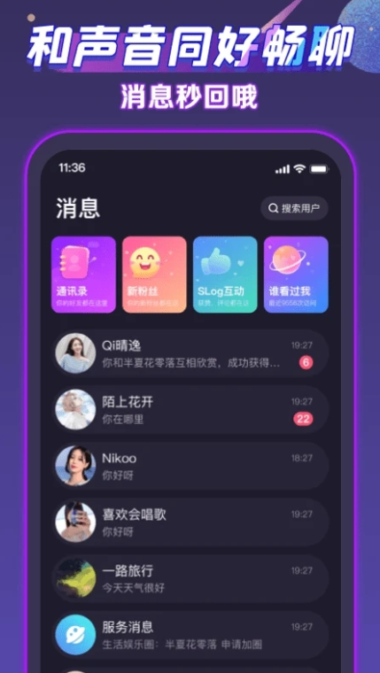 你可以在圈内发布动态,晒出你的珍藏,展示你的才艺,可以在房间里语音聊天,进行话题讨论,用声音的温度抵消地域的隔阂;在群里和朋友们即时展开聊天,24小时不断线。