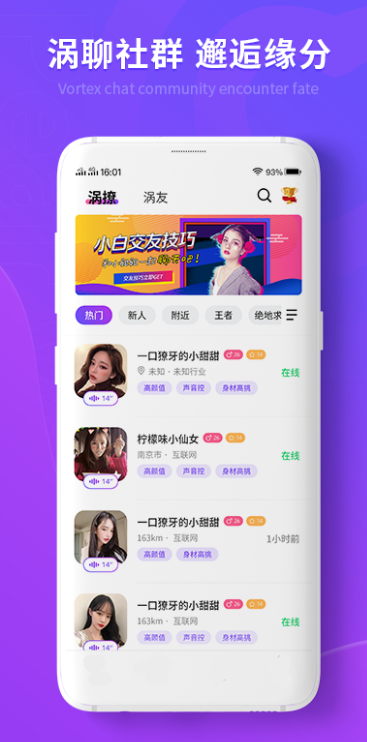 涡聊app是一款非常强大的社交聊天软件,在我们这款软件中你可以更好的享受优质的社交聊天的乐趣,无论你是来自哪里的单身男女性在我们这里你都能找到一个良好的心灵归宿,或者邂逅一场美丽的时光,喜欢的小伙伴赶紧下载安装。