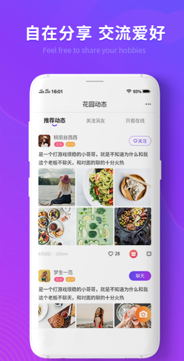 花园:展示推荐好友的动态或者你也可以发布自己的动态展示给好友看,类似于朋友圈!
