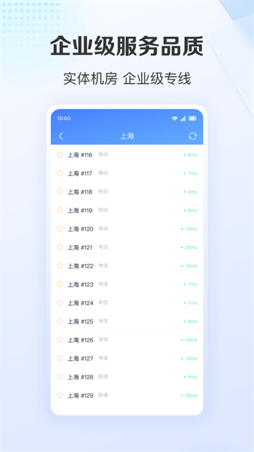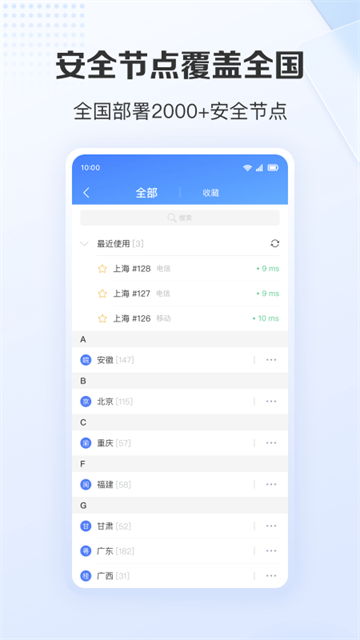 【便捷】无需配置,一键连接,因为专业,所以简单!界面简洁,清晰明了,一键切换稳定不断线的静态IP地址,自建纯净机房,独享千兆带宽,全国IP代理尽在掌握,1000+服务器节点轻松选择。没有区域限制,人在海外也可以使用。