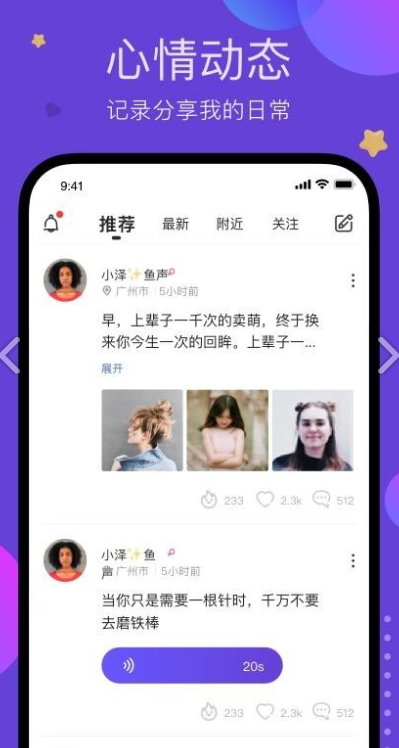 这是一个非常流行的语音聊天约会软件。数以千万计的用户再次见面,互相讲述他们的精彩故事。有很多方法可以让它带来欢乐。深夜故事,变声聊天,你画我猜,《谁的卧底》等游戏让人开心。你可以在玩游戏的时候找到你的密友,告诉对方共同的话题,
