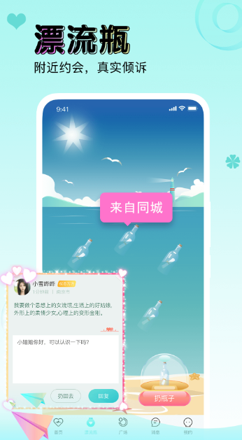 3.捞起一个来自未知领域的瓶子,装载着神秘、偶然、期待,读着对方的消息感受彼此生活,倾听别人心事。