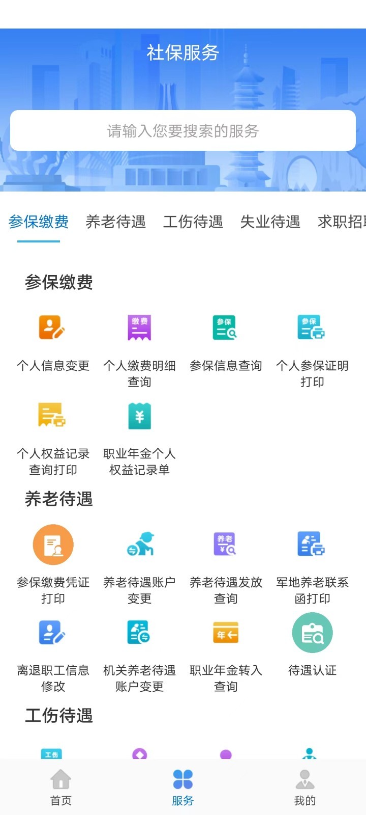 2、来到软件服务页面可使用参保缴费、养老待遇、工伤待遇等功能。