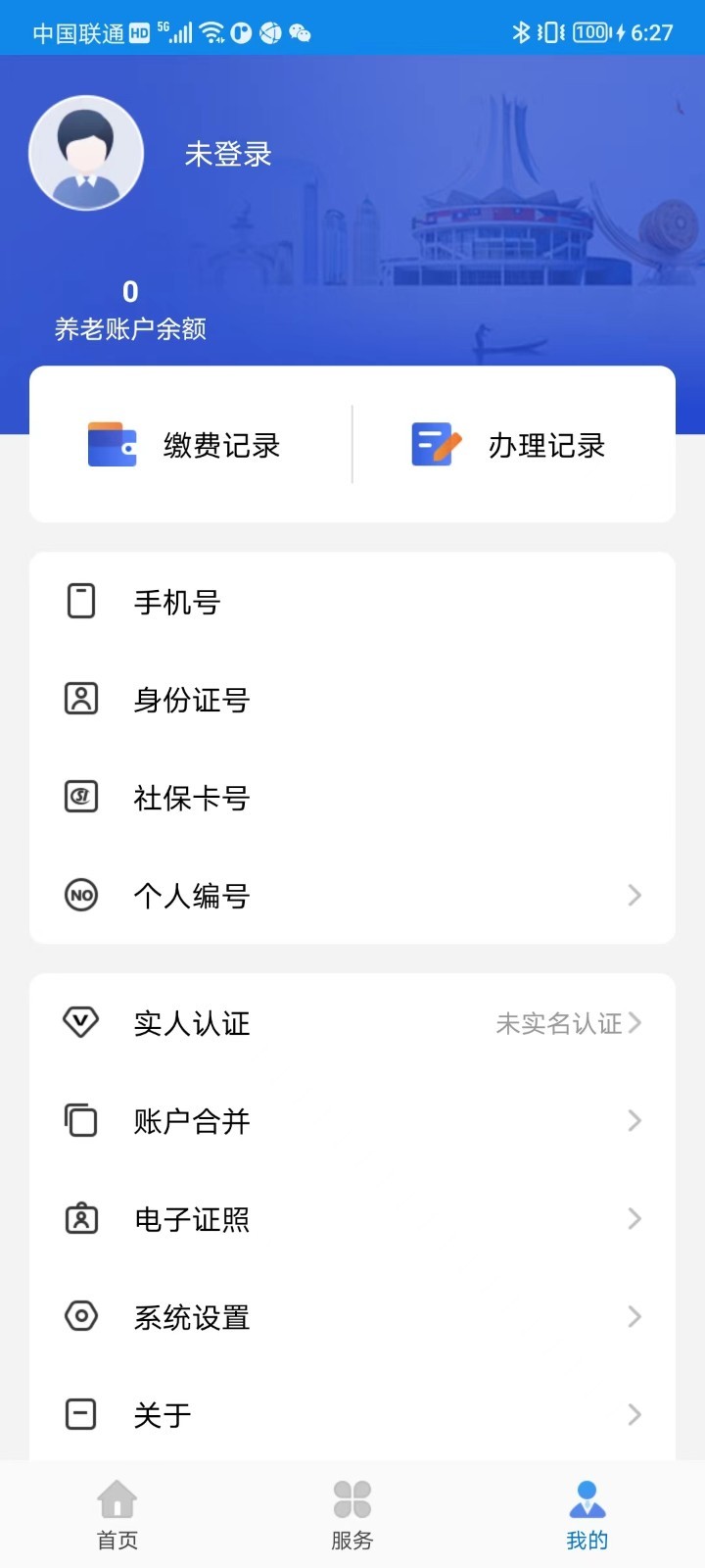 1、打开软件来到我的页面可使用缴费记录、办理记录等功能。