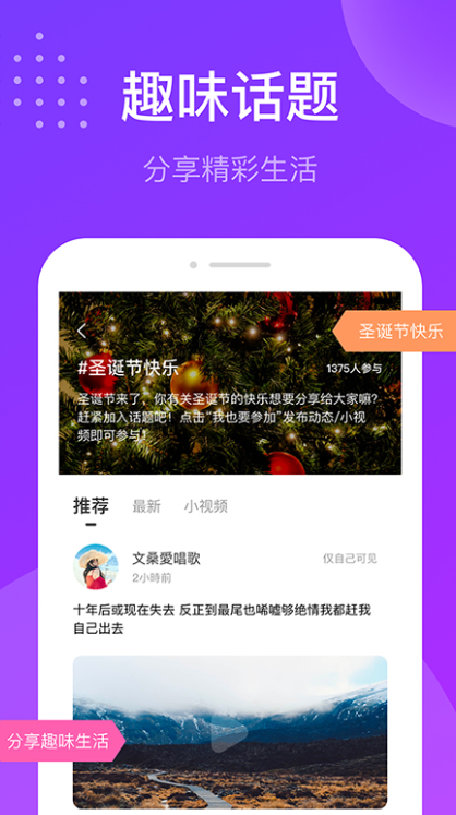 趣友聊app:一款最新推出的手机社交软件,我们此款趣友聊app上面有着海量的高品质单身用户和多种的在线的社交方式,能够让我们广大的用户朋友们在线的体验到随时随地社交生活,并且我们软件上所有的用户都是经过我们专业的审核过的,绝对的真人保证,然你体验最优质的社交生活。