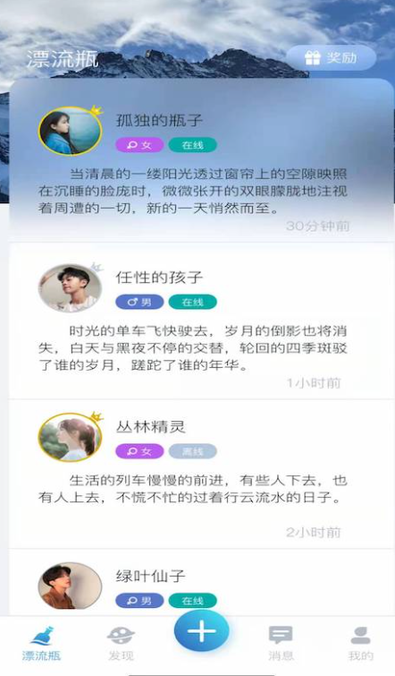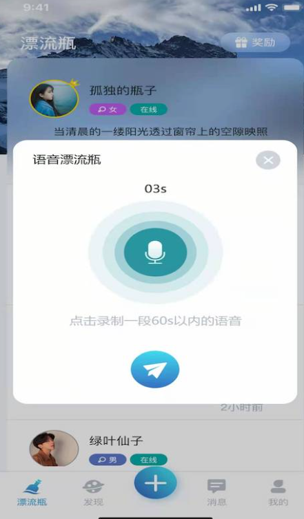 【漂流瓶子】可以扔漂流瓶子信号,可以捡漂流瓶子信号,倾听来自浩瀚宇宙里的呼唤,感受同一个世界里的另一种故事,找到那个更懂你的人倾诉与倾听。