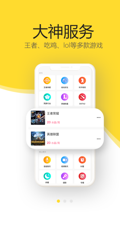 开玩覆盖当下热门游戏:英雄联盟、云顶之弈、绝地求生、刺激战场、王者荣耀、DOTA2、和平精英、声优技能教学等超多游戏陪玩品类。