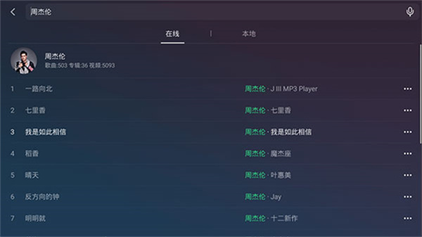 8、首页右上角-搜索,用户可以通过输入歌曲或歌手,搜索自己想要的音乐进行收听,支持文字输入和语音输入。