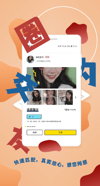 小圈社--与众不同的陪玩app海量美女等你来,体验高效邀约是否工作太忙没时间接触新朋友?是否生活太累没精力去谈恋爱约会?是否性格太闷没释放且找不到人解闷陪你?或许....你有许许多多的需求,但至少此刻,你还没有找到那个TA来小圈社吧!