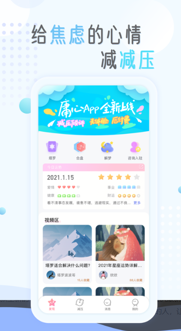 庸心app是一款最新推出的手机社交交友软件,此平台上拥有着很多的高颜值的小哥哥小姐姐,这里的你可以匿名找人倾诉内心的苦闷,给你的心情减减压。这里你还可以体验实时塔罗玩法,知晓自己的星座运势呢,有兴趣的可以来007游戏网下载体验吧。